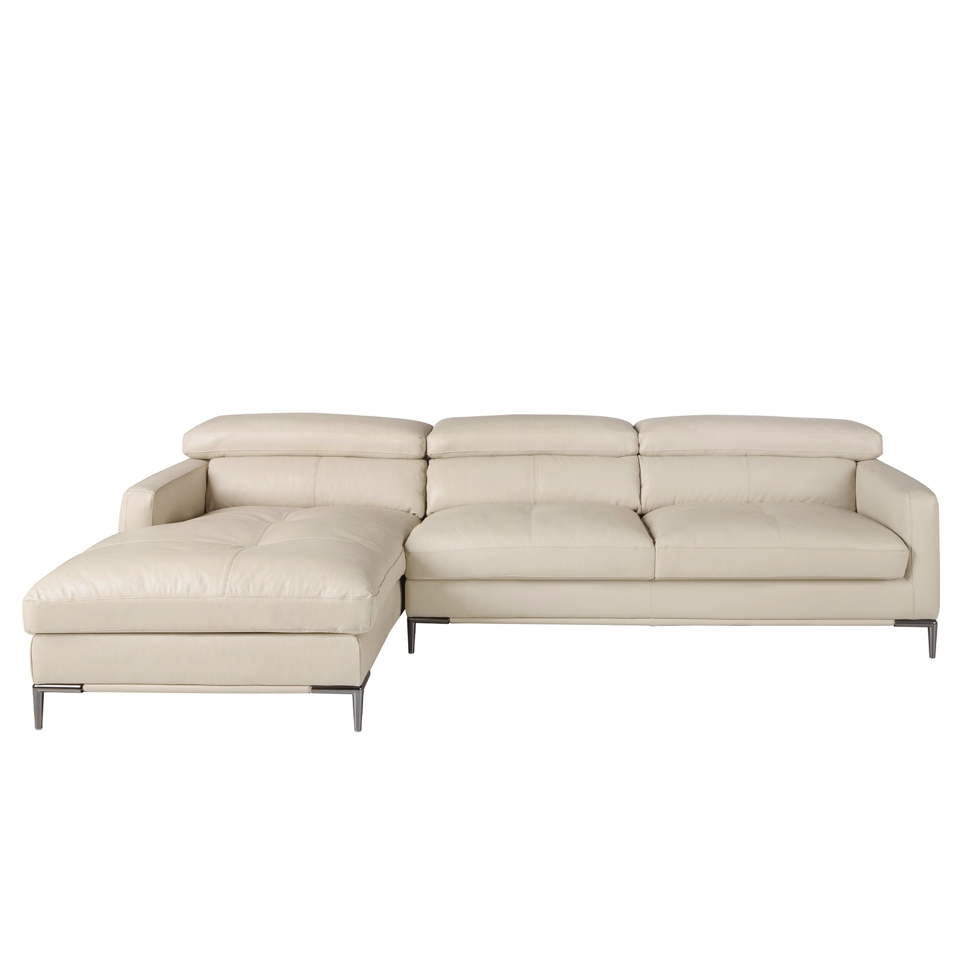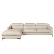 Divano a 5 posti con chaise longue sinistra dal design moderno, rivestito in pelle di vacchetta sabbia. Sia per il suo stile che per le sue gambe in acciaio inox cromato scuro, questo divano porterà il tocco di avanguardia ed eleganza che state cercando per la vostra casa.