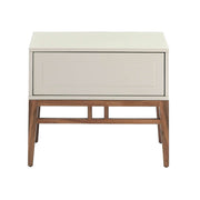 Comodino di design moderno con struttura in MDF beige e gambe originali in legno impiallacciato noce naturale. Dispone di un ampio spazio di archiviazione con 1 cassetto con sistema di apertura push and pull e chiusura ammortizzata.