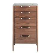 Chiffoniera dal design moderno con struttura in legno impiallacciato in noce naturale e originali gambe in legno impiallacciato in noce naturale. Grazie all'elegante piano in vetro che imita il marmo porcellanato bianco con venature grigie in finitura lucida, otterrete il look sofisticato che cercate per i vostri ambienti. Dispone di un ampio spazio di archiviazione con 5 cassetti con sistema di apertura a strappo e chiusura ammortizzata.
