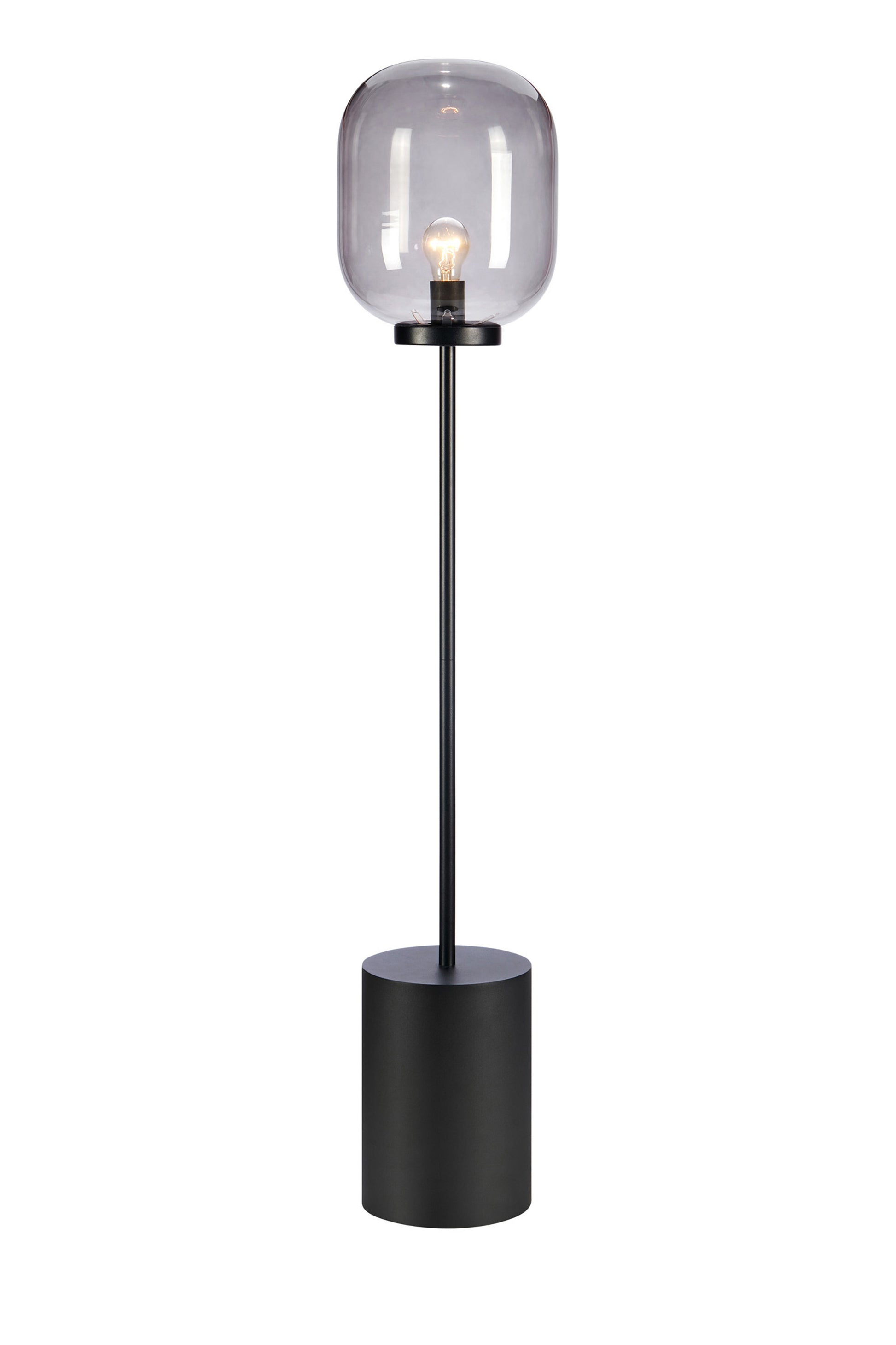 Una lampada da terra con una base robusta e uno stelo sottile in metallo nero. Paralume in vetro fumé sulla parte superiore, lascia visibile la lampadina e crea luce ambientale. Combina la lampada con una lampadina decorativa con attacco grande (E27) per creare un look unico. Una lampada che aggiunge carattere ad ogni stanza.