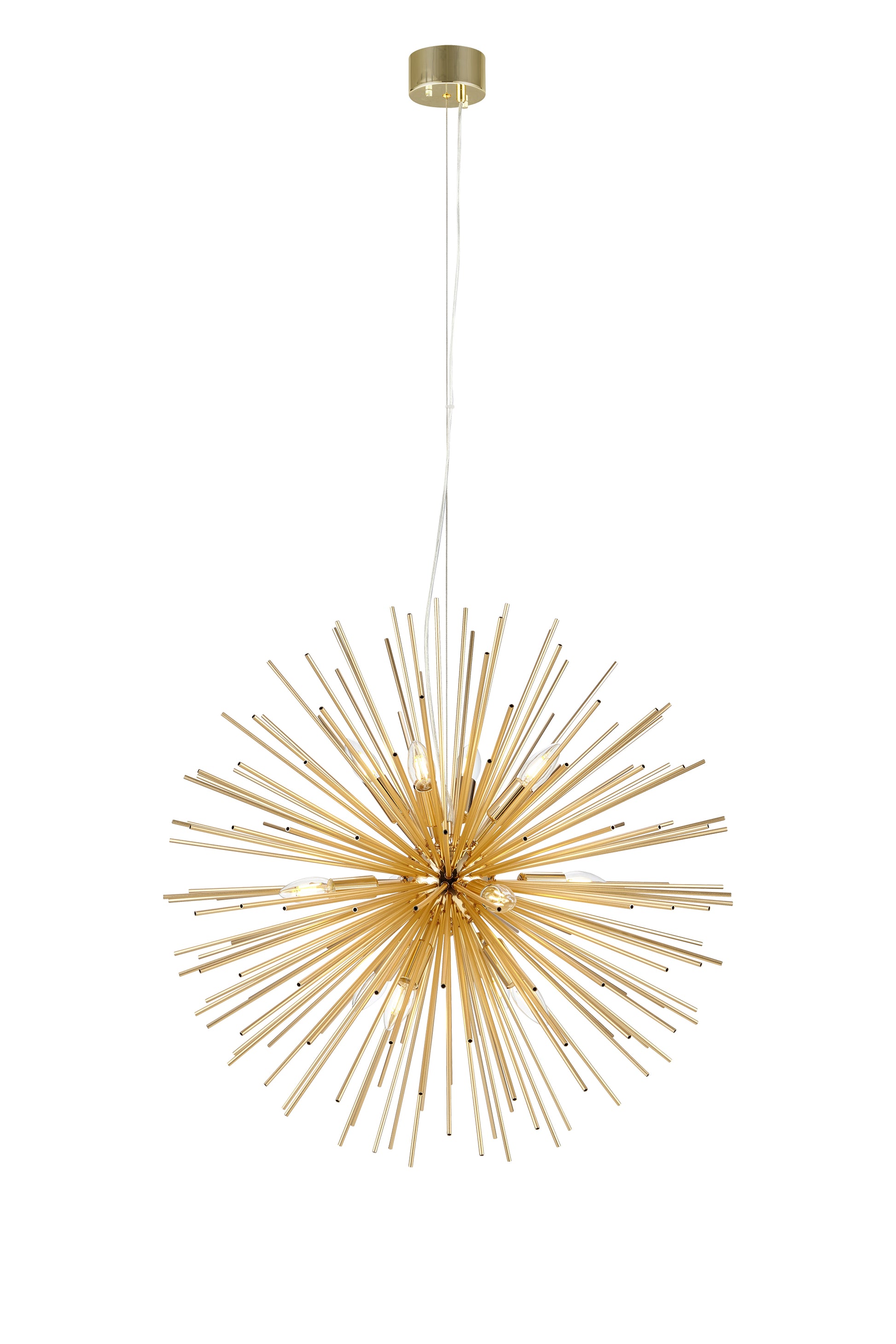 Soleil vuole letteralmente essere la star della stanza. Offre un'esperienza luminosa molto piacevole con le sue 12 lampade e le aste in metallo color oro.