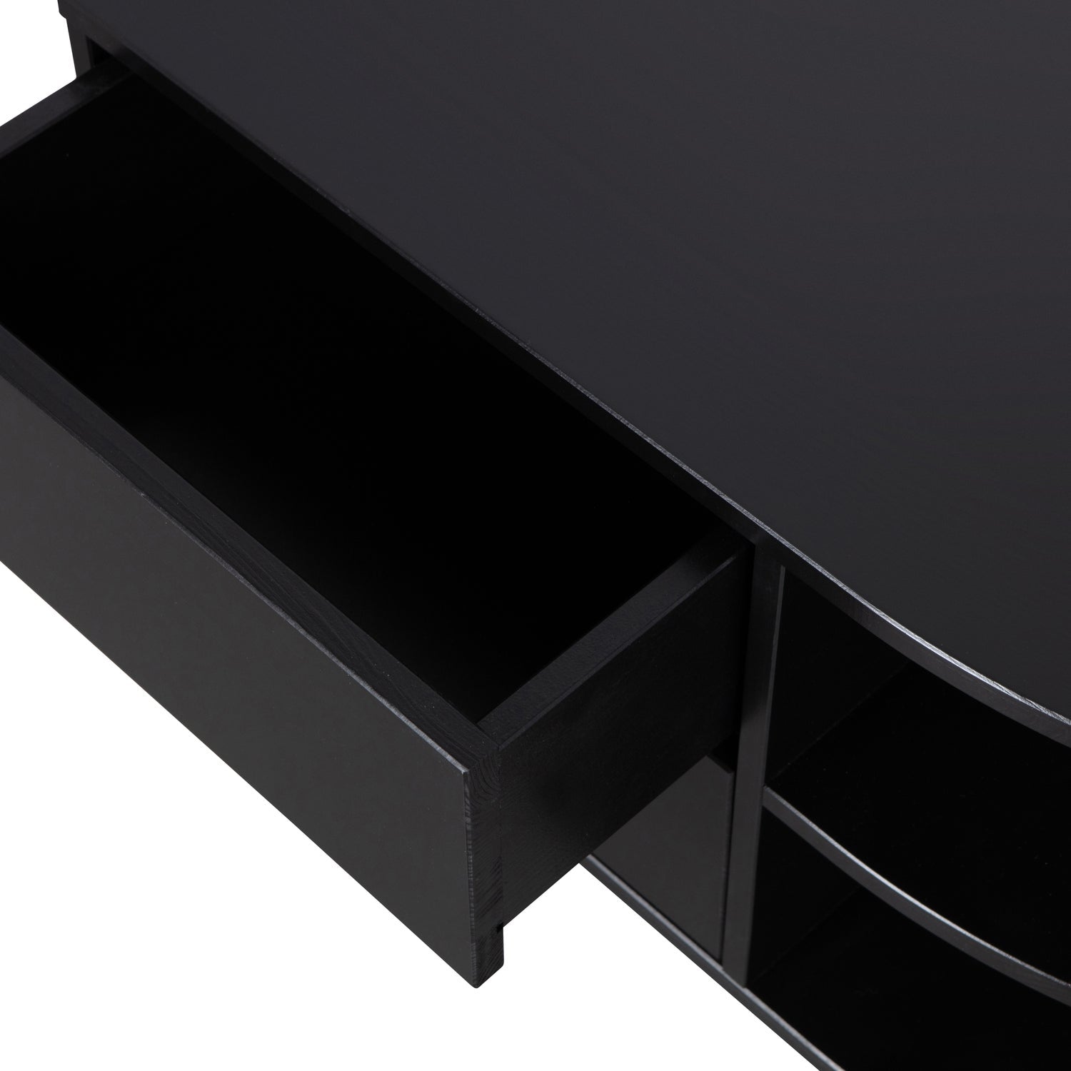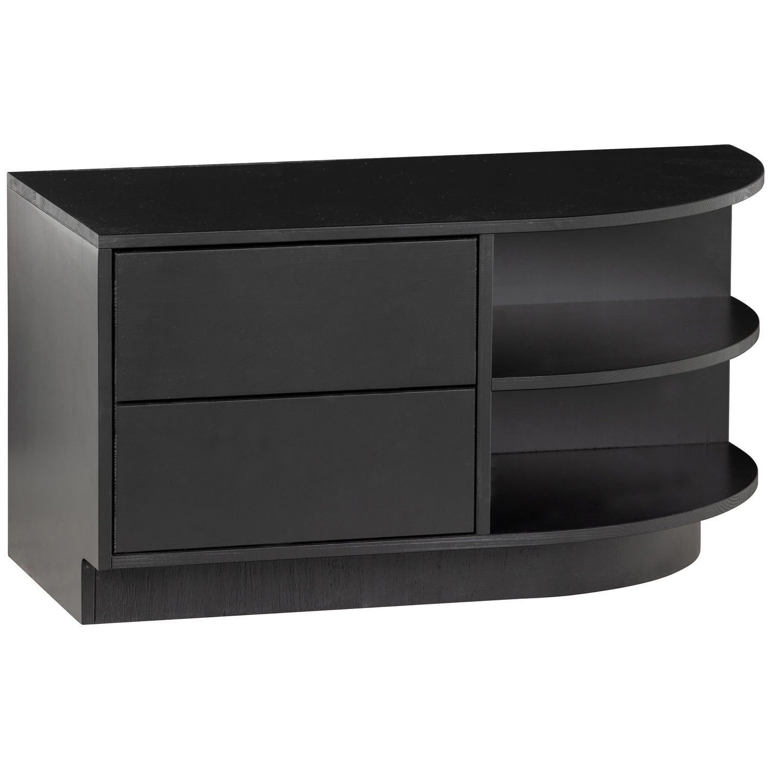 Il mobile TV Finca con elemento rotondo è un vero pezzo forte nel soggiorno. Gli scaffali aperti offrono spazio sufficiente per presentare la tua decorazione domestica più bella. I due cassetti mantengono nascosto alla vista un altro ampio spazio di archiviazione. Il bordo inferiore del mobile TV lascia 7 cm di spazio nella parte anteriore, conferendo al mobile l'aspetto sospeso.