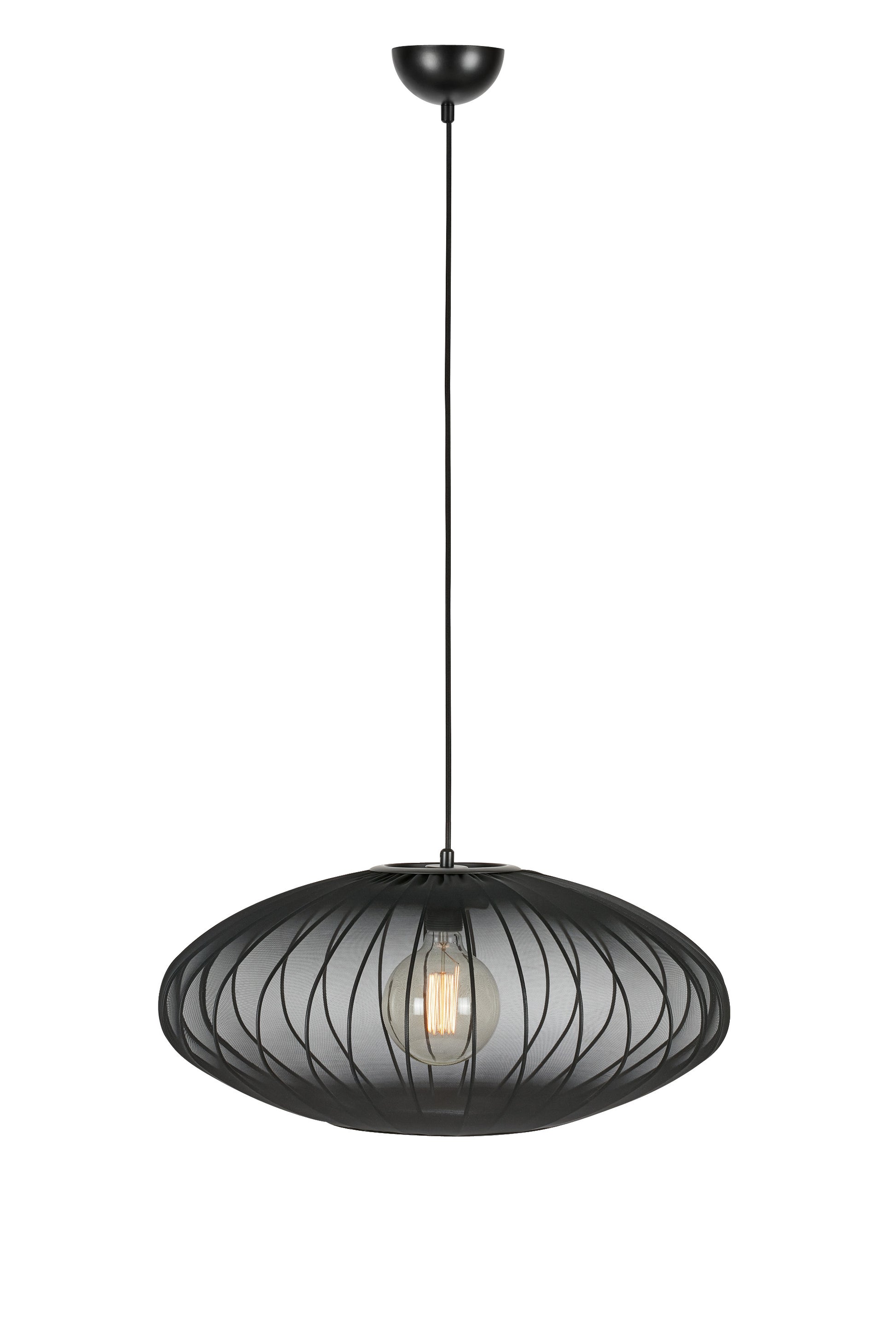 Ciondolo Firenze di Markslöjd. Diffusore in tessuto nero e rosone in metallo nero. Diametro 60 cm. Cavo tessile nero da 1,9 m. Sospensione a gancio. 1xE27, massimo 40 W. Sorgente luminosa non inclusa.