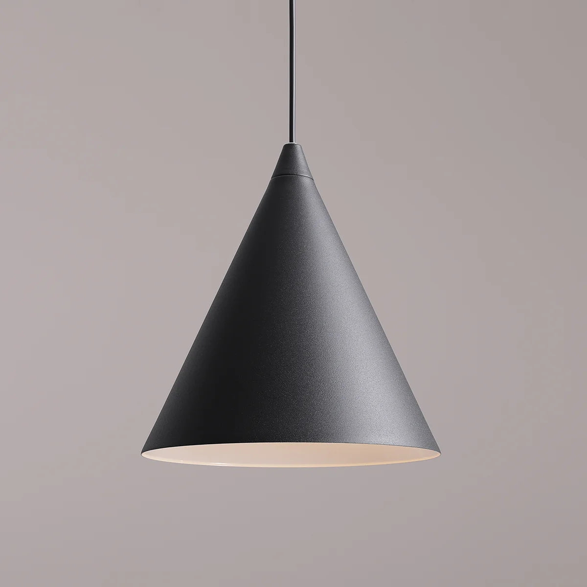 Un'unica e moderna lampada a sospensione con paralume a forma di cono in nero opaco. Gli spazi di soggiorni moderni, sale da pranzo, isole cucina o aree pubbliche sono perfetti per l'utilizzo di questa lampada.