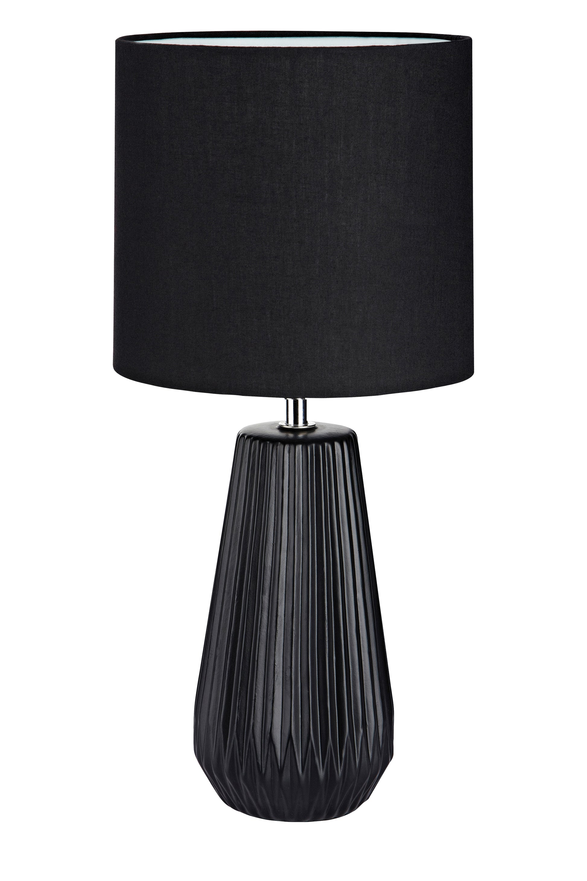 La lampada da tavolo Nicci è un'elegante lampada in ceramica nera splendidamente tagliata verticalmente. Schermo in tessuto nero con un diametro di 19 cm.