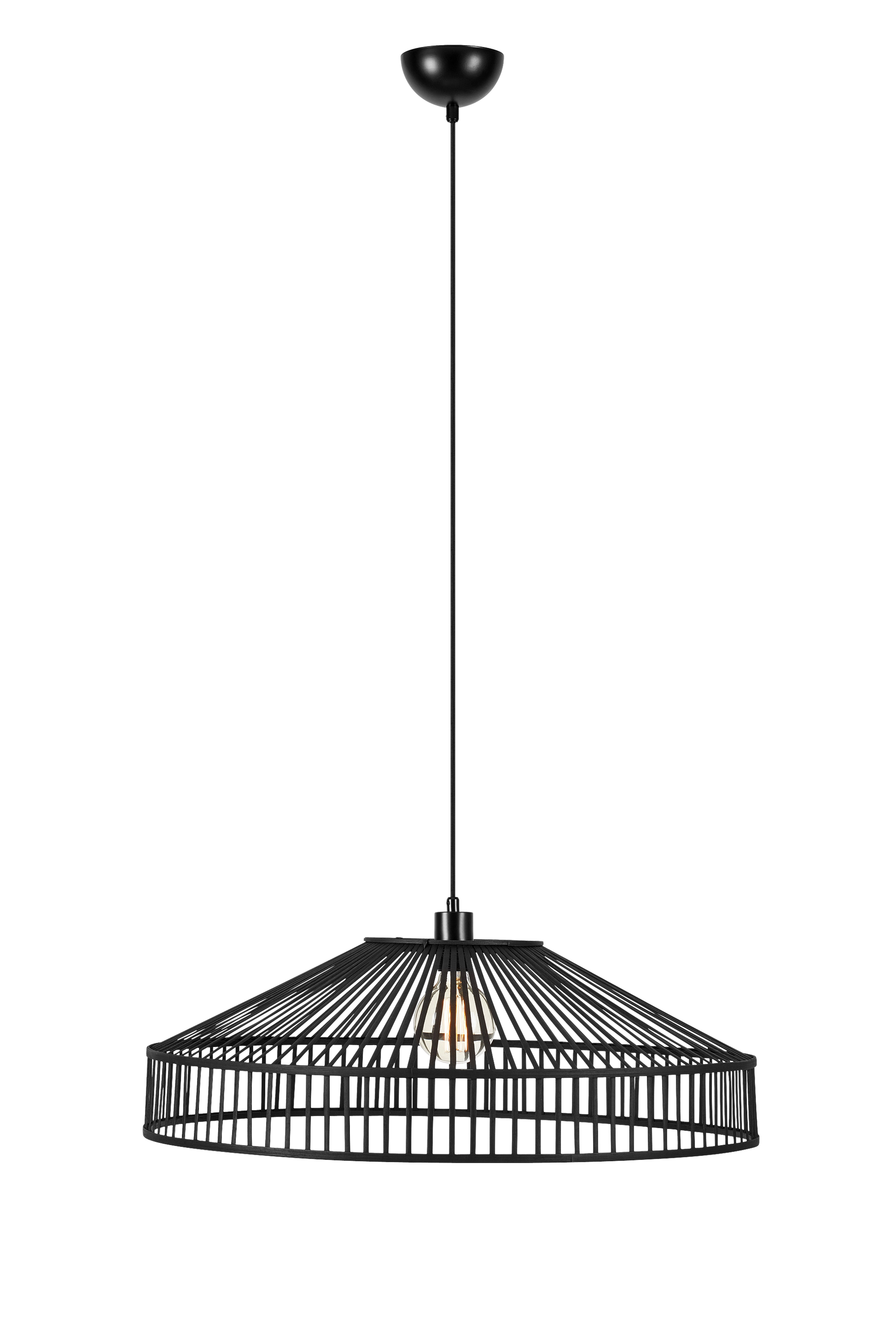 Lampada da soffitto rotonda e grande in stile rustico, realizzata a mano in bambù nero. La forma del paralume è semplice e ricorda un coperchio. Il paralume lascia visibile la sorgente luminosa, abbinalo a una sorgente luminosa decorativa adatta a te (non inclusa). La lampada ha un grande diametro di 70 cm e un'altezza totale di 23 cm. Si adatta perfettamente al tavolo da pranzo rotondo.
