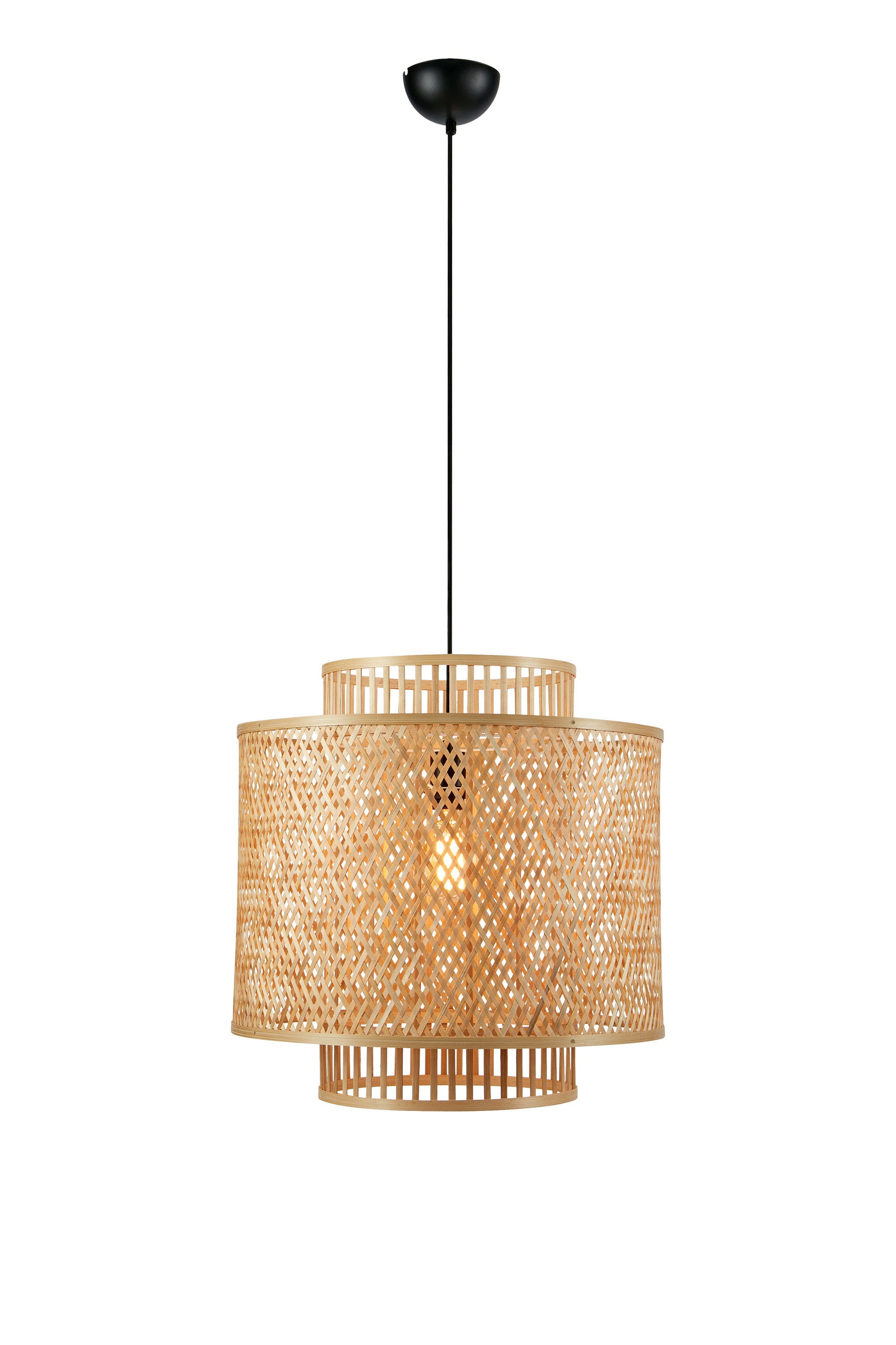 Lampadario Strati di Markslöjd. Base in metallo nero e paralume in bambù color naturale. Diametro 50 cm. Cavo tessile nero da 1,5 m. Sospensione a gancio. 1xE27, massimo 40W. Sorgente luminosa non inclusa