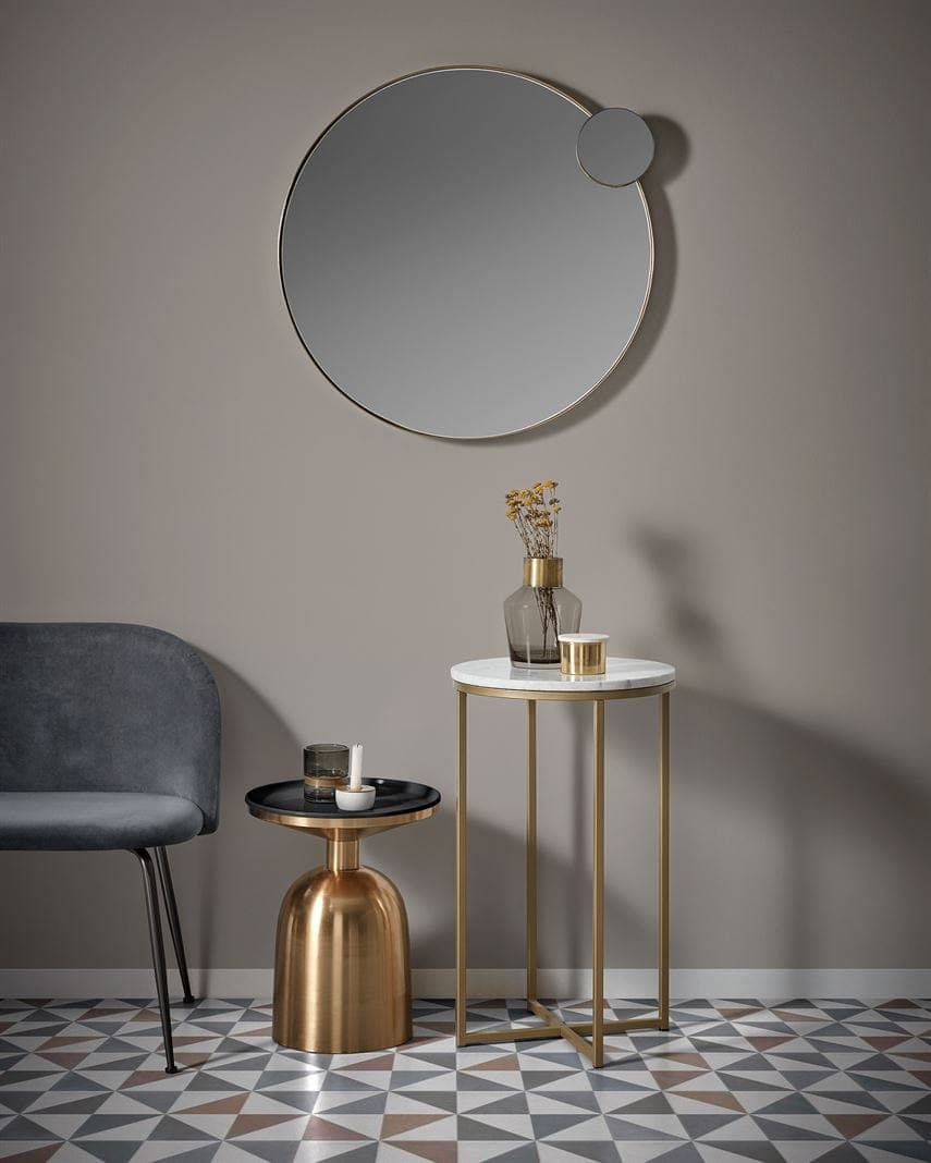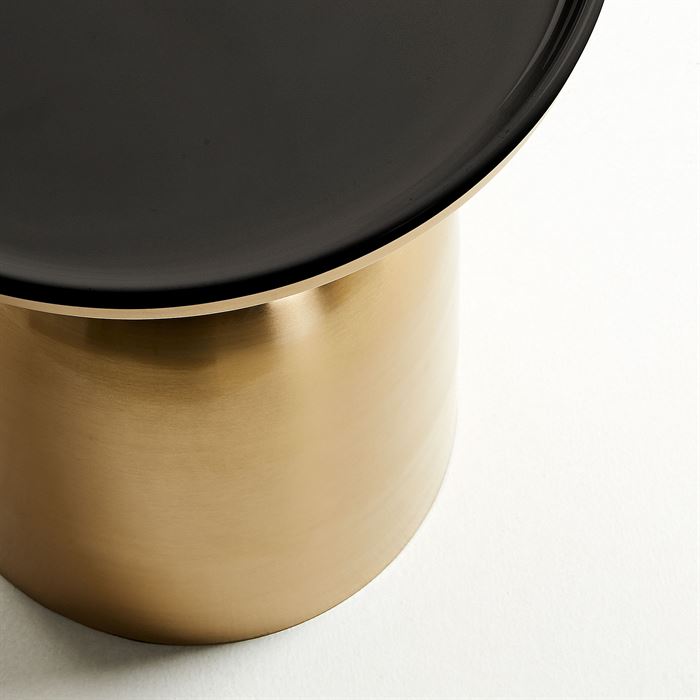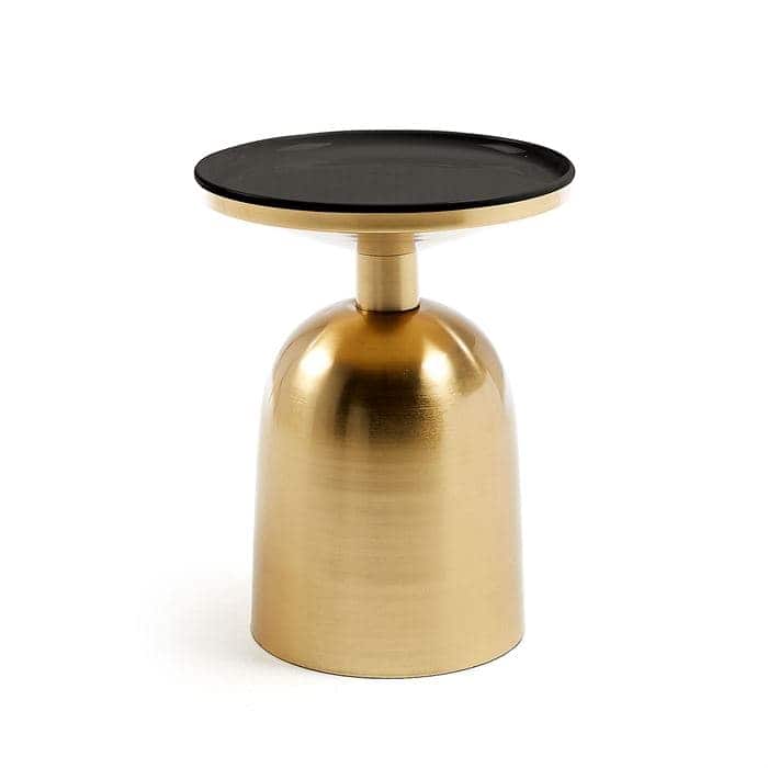 Tavolino in lamina d'acciaio con finiture dorate e piano in smalto nero.
